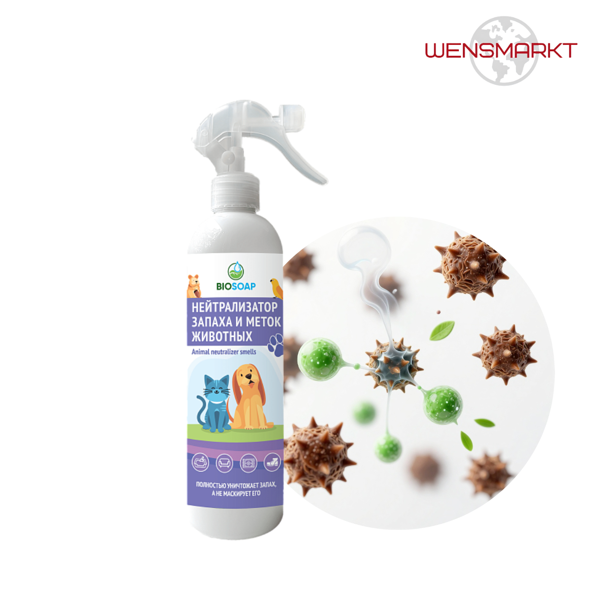 Специализированное средство для устранения запахов мочи, меток и других органических загрязнений животных. Энзимная формула разрушает молекулы запаха, а не маскирует их.
