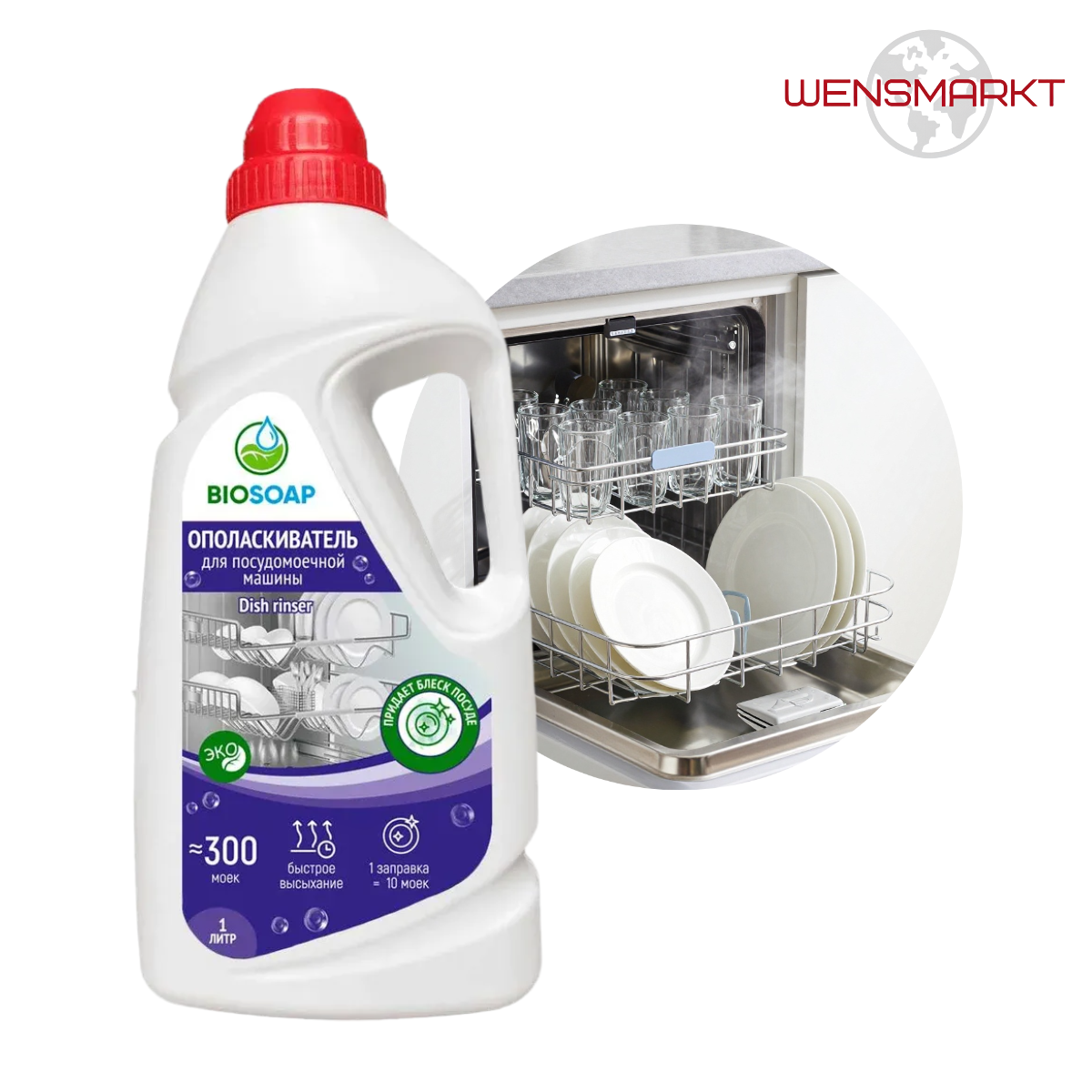 При ручном мытье: добавьте 5–10 мл в таз с чистой водой для ополаскивания. Для ПММ: залейте в отсек для ополаскивателя, отрегулируйте дозировку в зависимости от жёсткости воды.
