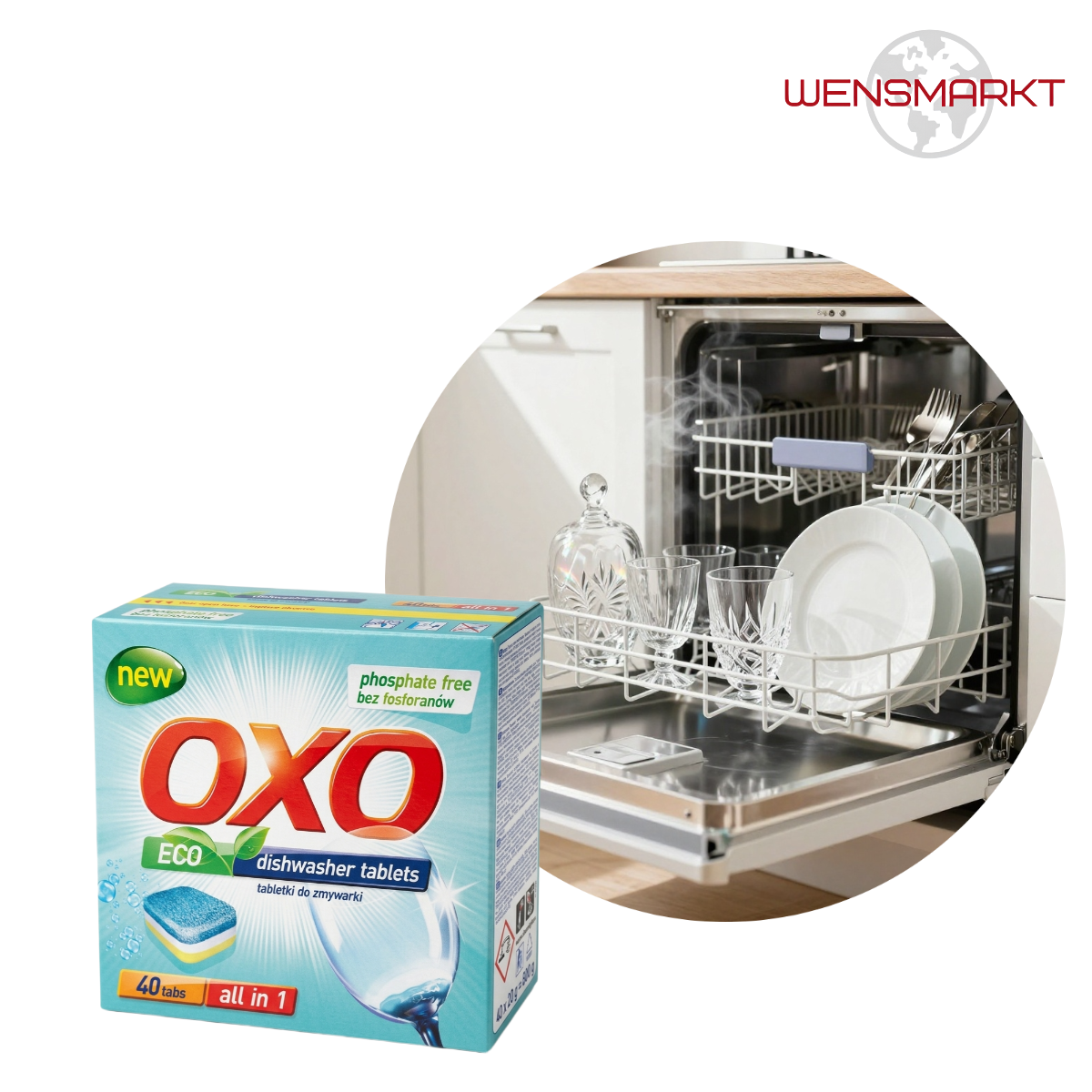 OXO ECO All in 1 — таблетки для посудомоечных машин, сочетающие моющее средство, ополаскиватель и соль. Биоразлагаемая формула безопасна для окружающей среды, эффективно моет посуду и защищает технику от накипи.