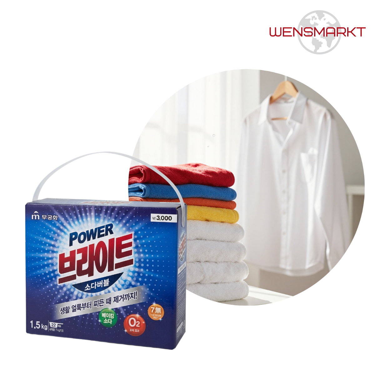 Mukunghwa Белизна и яркость — стиральный порошок на основе кислородного отбеливателя и соды. Эффективно удаляет пятна, освежает цвета и возвращает белизну без хлора.