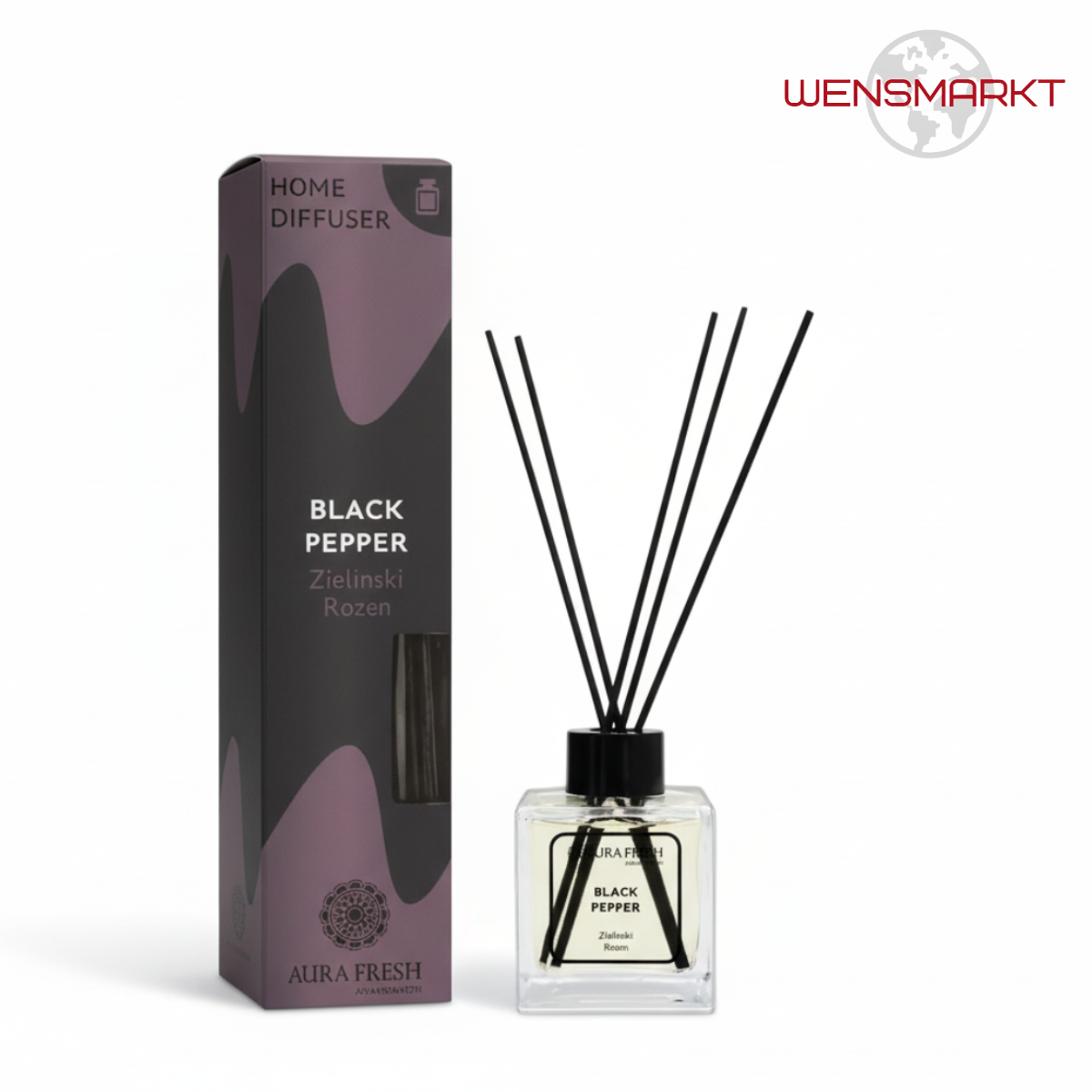 Аромадиффузор AURA FRESH с ароматом BLACK PEPPER (Черный перец) создаст в вашем доме атмосферу уюта и гармонии. Острый и пряный аромат чёрного перца с древесными оттенками придаёт интерьеру динамичность и характер, наполняя помещение энергией и стилем. Объем флакона 50 мл.