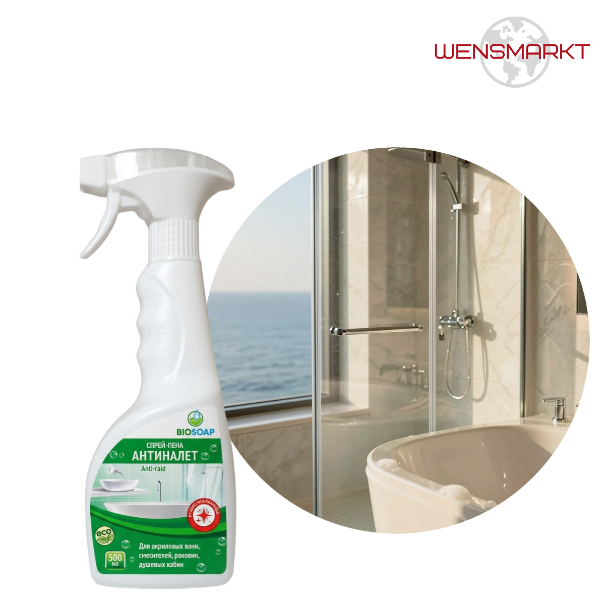 Пенный спрей для быстрого удаления известкового налёта, мыльных отложений и ржавчины с душевых кабин, стекол, хромированных поверхностей и кафеля. Пенная формула не стекает и действует точечно.