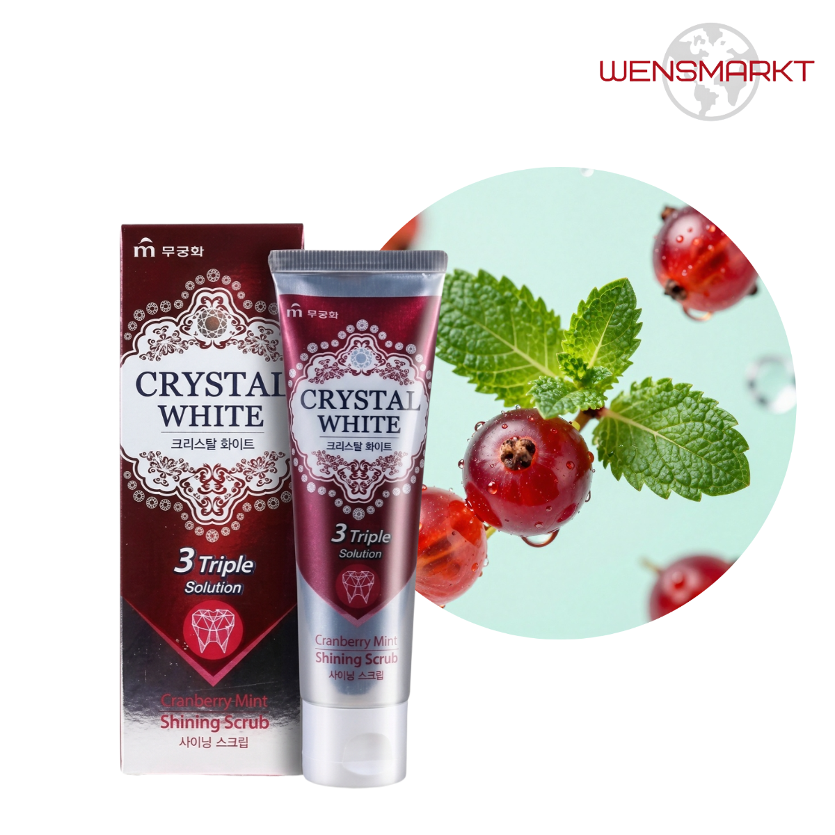 Отбеливающая паста “Crystal White” с ярким сочетанием клюквы и мяты превращает ежедневную гигиену в удовольствие. Клюква известна своим высоким содержанием витаминов и природных кислот, которые помогают бороться с бактериями, а мята дарит классическую свежесть. Паста эффективно осветляет эмаль, делая улыбку сияющей, и обеспечивает длительную защиту от кариеса. Объём тубы — 110 г.